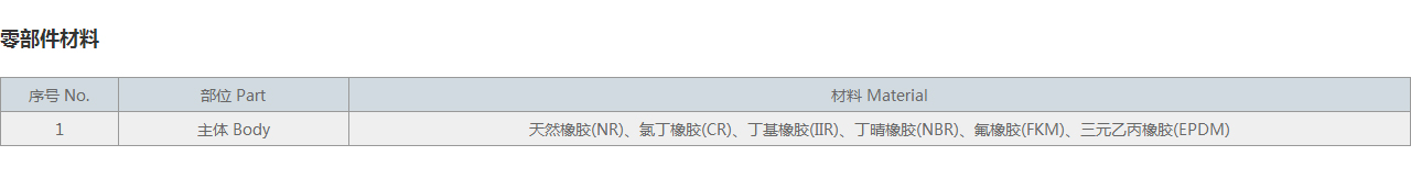 | 1 | 主體 Body | 天然橡膠(NR)、氯丁橡膠(CR)、丁基橡膠(IIR)、丁晴橡膠(NBR)、氟橡膠(FKM)、三元乙丙橡膠(EPDM) |