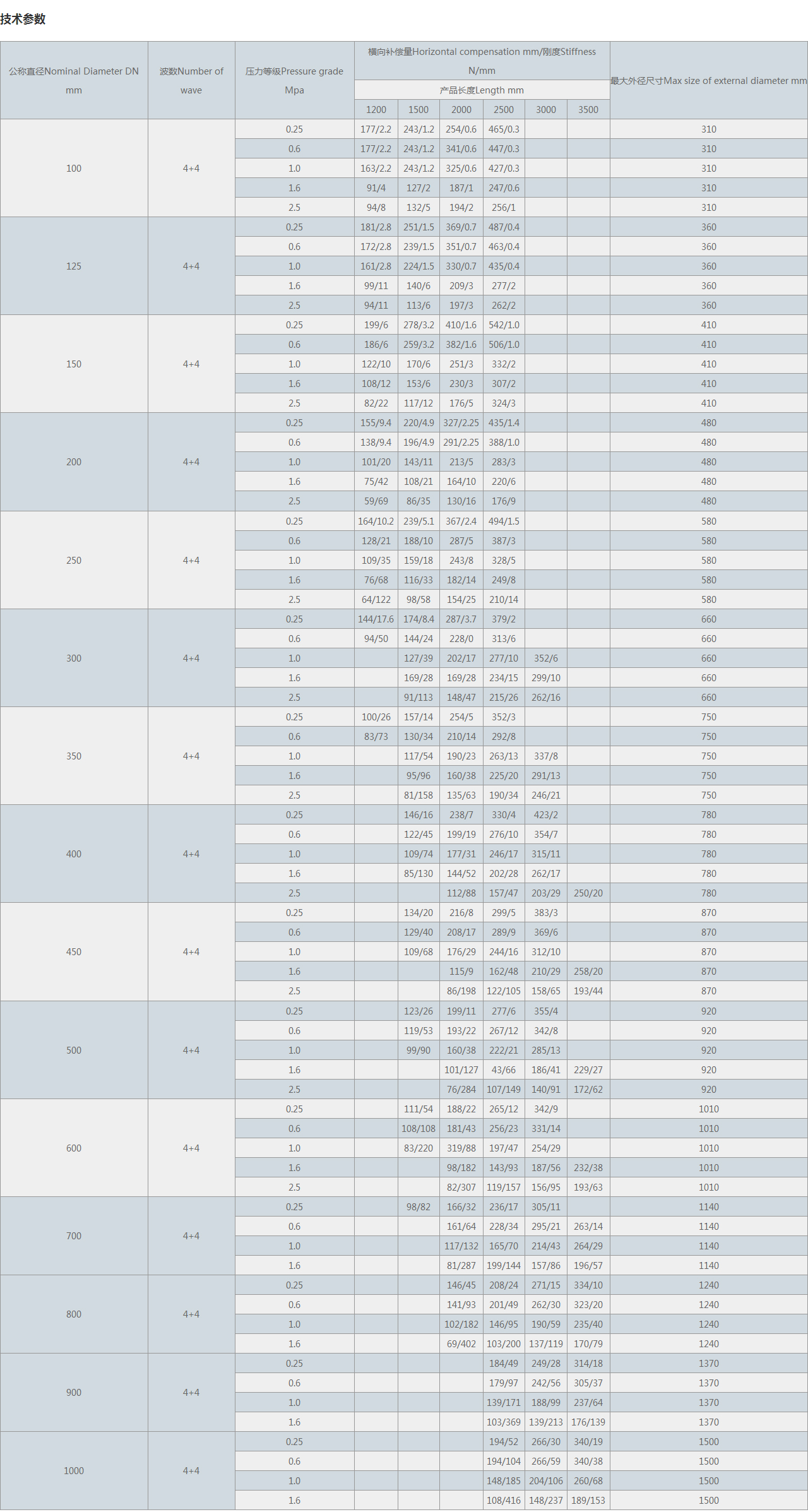 | 公稱直徑Nominal Diameter DN mm | 波數(shù)Number of wave | 壓力等級Pressure grade Mpa | 橫向補償量Horizontal compensation mm/剛度Stiffness N/mm | 很大外徑尺寸Max size of external diameter mm | |||||