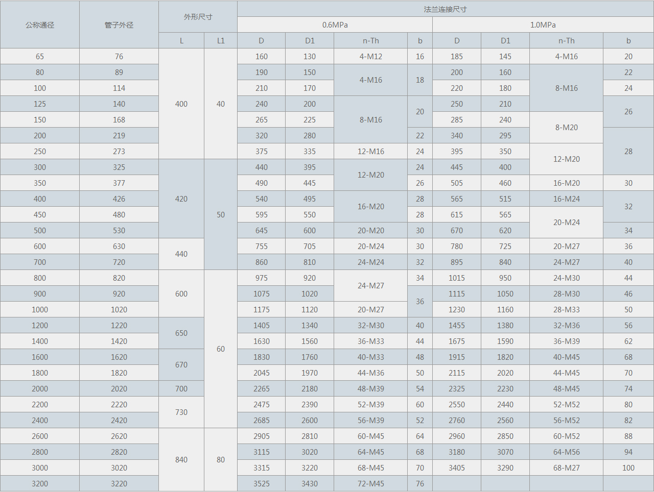 | 公稱通徑 | 管子外徑 | 外形尺寸 | 法蘭連接尺寸 | ||||||||