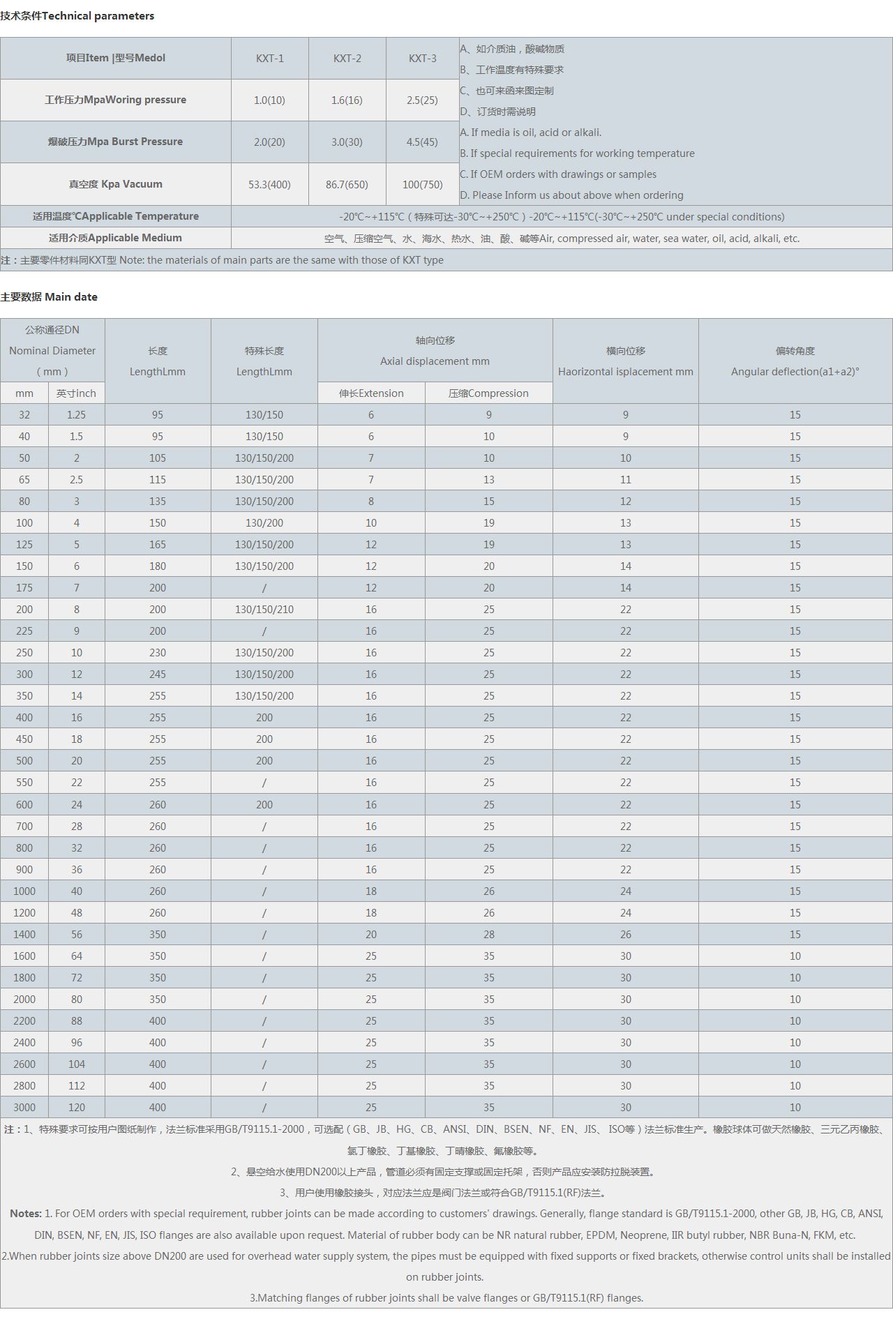 | 注:1、特殊要求可按用戶圖紙制作,可選配(GB、JB、HG、CB、ANSI、DIN、BSEN、NF、EN、JIS、 等)法蘭標(biāo)準(zhǔn)生產(chǎn)。橡膠球體可做天然橡膠、三元乙丙橡膠、氯丁橡膠、丁基橡膠、丁晴橡膠、氟橡膠等。 2、懸空給水使用DN200以上產(chǎn)品,管道必須有固定支撐或固定托架,否則產(chǎn)品應(yīng)安裝防拉脫裝置。 3、用戶使用橡膠接頭,對(duì)應(yīng)法蘭應(yīng)是閥門法蘭。 Notes: 1. For OEM orders with special requirement, rubber joints can be made according to customers' drawings. Generally, flange standard is, other GB, JB, HG, CB, ANSI, DIN, BSEN, NF, EN, JIS, flanges are also available upon request. Material of rubber body can be NR natural rubber, EPDM, Neoprene, IIR butyl rubber, NBR Buna-N, FKM, etc. 2.When rubber joints size above DN200 are used for overhead water supply system, the pipes must be equipped with fixed supports or fixed brackets, otherwise control units shall be installed on rubber joints. 3.Matching flanges of rubber joints shall be valve flanges or flanges. |