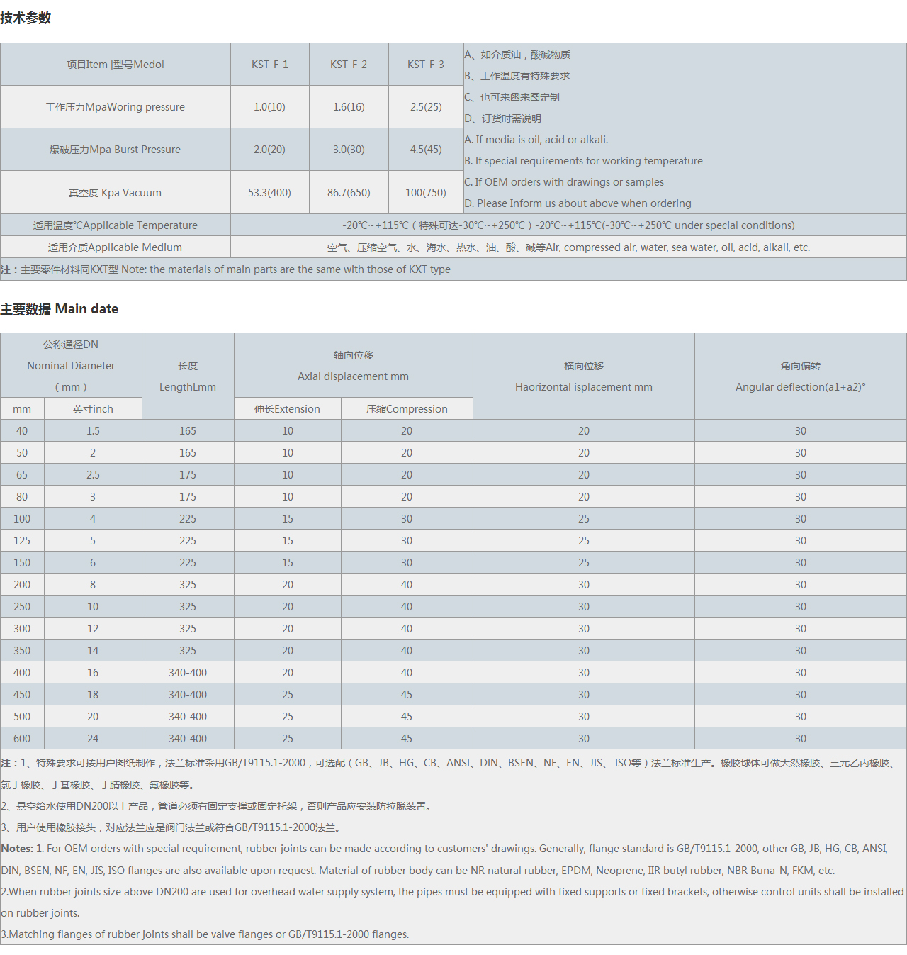 | 注:1、特殊要求可按用戶圖紙制作,可選配(GB、JB、HG、CB、ANSI、DIN、BSEN、NF、EN、JIS、 等)法蘭標準生產。橡膠球體可做天然橡膠、三元乙丙橡膠、氯丁橡膠、丁基橡膠、丁腈橡膠、氟橡膠等。 2、懸空給水使用DN200以上產品,管道必須有固定支撐或固定托架,否則產品應安裝防拉脫裝置。 3、用戶使用橡膠接頭,對應法蘭應是閥門法蘭。 Notes: 1. For OEM orders with special requirement, rubber joints can be made according to customers' drawings. Generally, flange standard is , other GB, JB, HG, CB, ANSI, DIN, BSEN, NF, EN, JIS, flanges are also available upon request. Material of rubber body can be NR natural rubber, EPDM, Neoprene, IIR butyl rubber, NBR Buna-N, FKM, etc. 2.When rubber joints size above DN200 are used for overhead water supply system, the pipes must be equipped with fixed supports or fixed brackets, otherwise control units shall be installed on rubber joints. 3.Matching flanges of rubber joints shall be valve flanges or flanges. |